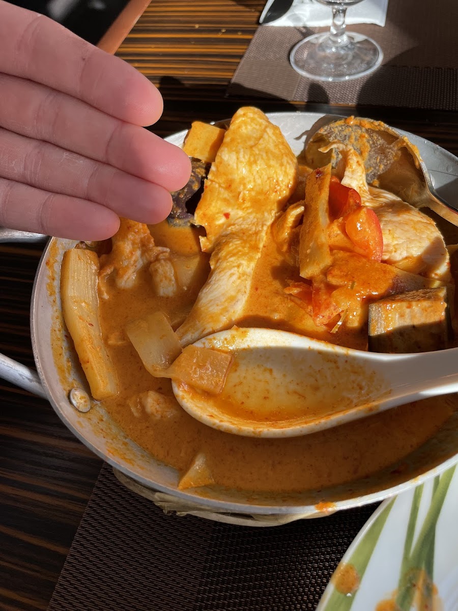 The food is overall okay, just a bit on the salty (which seems quite common in Sweden!); the look of the dish though destroys the atmosphere - please put some ‚love‘ into the food you sell and cut the veggies and the chicken into smaller pieces … who is going to ‚stuff‘ a 12cm long piece (see pictures) of chicken and pepperonis of 5-6cm in size in his mouth? Red curry is jot supposed to be cut after its served but just enjoyed with a spoon and a fork.